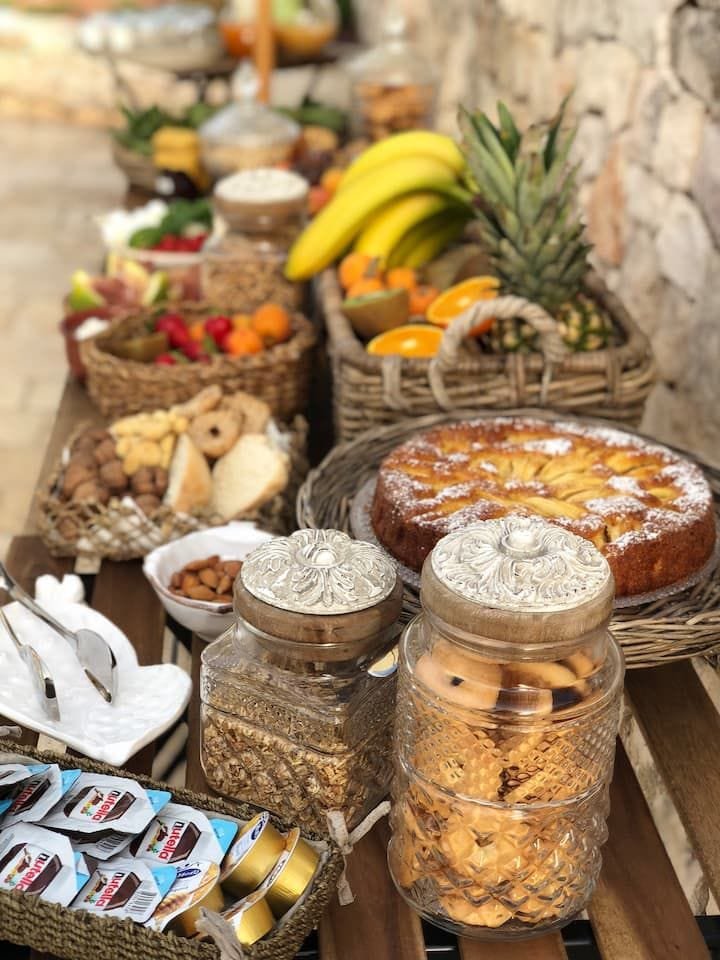 La colazione viene servita sotto il porticato, uno spazio all’aperto dove iniziare la giornata con calma, immersi nella tranquillità della campagna.